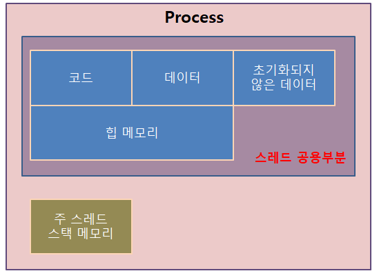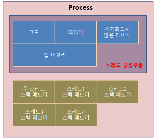 프로세스 내부의 스레드들은 프로세스의 자원을 동시에 접근 할 수 있기 때문에 동기화 작업에 신경써야 합니다.
