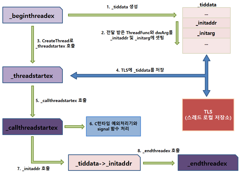 - _beginthreadex로 전달 받은 진입점 함수와 매개변수를 _tiddata 메모리 블록의 _initaddr, _initarg에 저장합니다.
