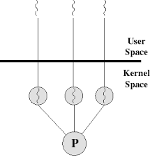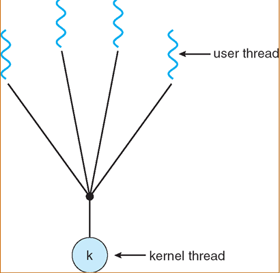 사용자 수준 쓰레드에서는 쓰레드 교환에 커널이 개입하지 않아 커널에서 사용자 영역으로 전환할 필요가 없다. 그리고 커널은 쓰레드가 아닌 프로세스를 한 단위로 인식하고 프로세서를 할당한다. 다수의 사용자 수준 쓰레드가 커널 수준 쓰레드 한 개에 매핑되므로 다대일 쓰레드 매핑이라고 한다.