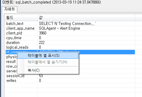 - 보고자 하는 항목을 테이블에 열 표시 선택