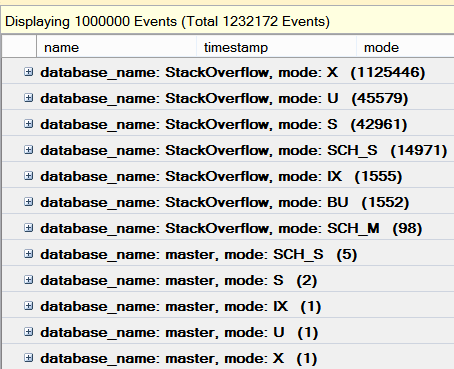 <Database name="StackOverflow"> <Locks> <Lock request_mode="S" request_status="GRANT" request_count="1" /> </Locks> <Objects> <Object name="(null)"> <Locks> <Lock resource_type="FILE.FILE_SHRINK" request_mode="X" request_status="GRANT" request_count="1" /> </Locks> </Object> <Object name="Posts" schema_name="dbo"> <Locks> <Lock resource_type="OBJECT" request_mode="IX" request_status="GRANT" request_count="1" /> <Lock resource_type="PAGE" page_type="*" index_name="kl_Posts_OwnerUserId_CreationDate" request_mode="X" request_status="GRANT" request_count="3" /> <Lock resource_type="PAGE" page_type="*" index_name="kl_Posts_OwnerUserId_CreationDate" request_mode="X" request_status="WAIT" request_count="1" /> </Locks> </Object> </Objects> </Database> |