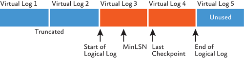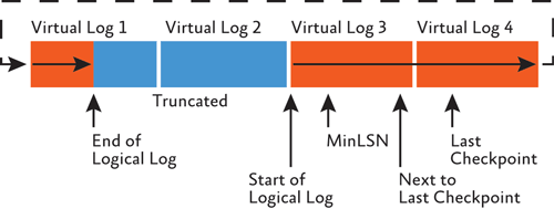 Active VLFs make up the logical log—the portion of the transaction log that contains all the active log records. The database itself knows where crash recovery should start reading log records within the active portion of the log—the start of the oldest active transaction in the log, the MinLSN (this is stored in the database boot page).